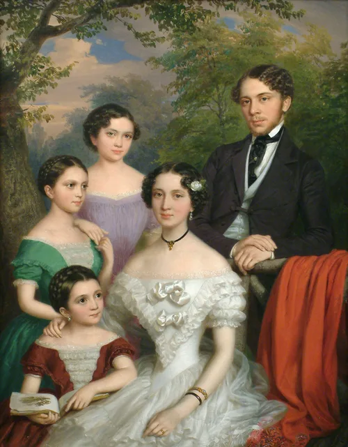 Apa: gróf Degenfeld-Schomburg Imre, anya: Beck Paulina. A festmény címe korábban A Degenfeld család, amely Várkonyi Tibor genealógiai kutatásainak eredményei alapján módosult, a mű csak az öt gyereket ábrázolja: Gusztáv, (feleség: gróf Karacsay Melinda), – Anna, (férjezett: herceg Odescalchi Gyula), – Ilona, (férjezett: gróf Tisza Kálmán), – Berta, (férjezett: báró Podmaniczky Géza), – Emma, (férjezett: gróf Károlyi Tibor). BM Jegyzőkönyvében a festmény nem szerepel, a téves cím ennek köszönhető. A kulissza-háttér előtt a csinosan elrendezett csoport szereplőin látszik, hogy külön-külön álltak modellt, együttesüket a festő nem dolgozta össze. Az egymásra vetülő árnyékok nem meggyőzőek, a Művész nem törekedett egy valóságos csoport megalkotására, a progresszív képalkotás még várat magára. A szereplők merevek, szemük ösze-vissza vetül. Egyedül a középen ülő 18 éves Anna természetes, ő a centrum, akit testvéreinek koszorúja vesz körül. A kislányok viszonylag egyszerűen öltözöttek, csak Anna – az eladó lány – visel díszes fehér báliruhát, amit a Művész különös gonddal adott vissza. A kép megalkotása túságosan kis felületen történt, az egész előadás inkább életnagyságban érvényesülne. Ám minden problémájával együtt a kép igazán kellemes, a család otthonának dísze lehetett.