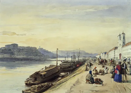 A nagylátószögű dunai veduta-sorozat egy lapja, kilátással észak felé, a Várheggyel és az épülő Lánchíddal. A távlatok, a méretek igazi nagyvárost mutatnak. Mintha két mű lenne, a víz, a Várhegy, az égbolt finoman úsztatott ecsettel, kék ködökkel, halványsárga fényekkel hangulatosan megfogalmazva tűnnek elénk, míg az előtér zsáner-részlete – remek perspektívával – aprólékosan előadva, szinte egy más világ. Ajándék a kedves londoni vendéglátónak, mivel az első példányt Pickersgill megkapta, ez a replika.