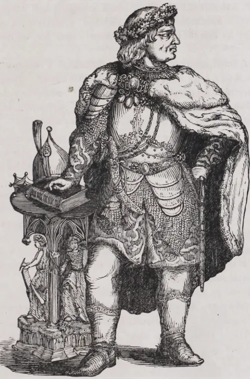 Gipszszobor rajza (eredeti magasság: 40 cm). A szobor a Pesti Műegylet 1844-es tárlatán volt kiállítva, (Pótléklajstrom, kat sz: 223.) (Alexy szobormintája. Illusztráció Henszlmann Imre ismertetőjéhez. Életképek 1844: 407.) Ezzel megszületett az első illusztrált kritika a műegyleti kiállítások egy darabjáról. A felcsapó lelkesedés talán befolyásolta a kiváló szobrásztehetség, Alexy döntését abban, hogy a következő évben hazatelepült. ,,Egyben egy különös jogi vita is kibontakozott, amely szintén példa nélküli eleddig. Petrichevich Horváth Lázár a Honderű-ben tiltakozik a szobor rajzának közlése ellen, mivel a gipszminta az ő tulajdona, Henszlmann jogtalanul járt el, hogy közzétette. Különösen azért tiltakozik, mert a rajz rossz, ,,gnómszerű carricatura” alakban mutatja a nagy Corvint. (Heti Szemle, Honderű 1844, Nyárhó II. 224.) Henszlmann válaszában ezt visszautasította, és egész polémia bontakozott ki, mely végül is a régóta vajudó Mátyás-emlék körüli anomáliák taglalásába torkollt. Petrichevich kritikájában van valami igazság. Barabás Miklósnak mindig baja volt a kontraposzt rajzában a súlyt hordozó lábbal. (Lesi 1941, 33.; Szvoboda Dománszky 2007: 105.