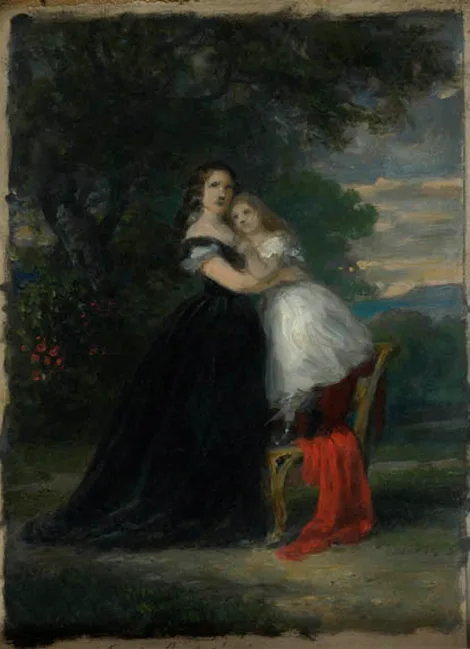 A kép hátoldalán papíron: A kép pazonyi Elek Gusztávnét mezőpeterdi Gázsy Etelkát és Margit leányát férjezett beodrai Karátsonyi Andornét ábrázolja (1870–71-ben).