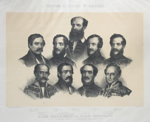 Felirat f. k.: 896–1896 AZ EZREDIK ÉV EMLÉKÉRE. Lent Balról jobbra a kormány tagjainak névsora két sorban: DEÁK FERENCZ / igazságügy (Justiz.); KOSSUTH LAJ. / pénzügy (Finanzen.) GR. BATTHYÁNYI LAJ. / elnök (Präses:); BR. EÖTVÖS JÓS. / (Cultus.); SZEMERE BERT. belügy. (Inneres.); / MÉSZÁROS LÁZ. / hadügy (Krieg.); KLAUZÁL GÁB. / földmível. és ipar. (Agricult. u. Industrie); GR. SZÉCHÉNYI ISTV. / közlekedés (Comunication.); HC ESZTERHÁZY PÁL. / külügy. (Auswärtiges.) A nevek alatt középen: AZ ELSŐ MAGYAR FÜGGETLEN FELELÖS MINISTERIUM. / ERSTES UNGARISCHES UNABHÄNGIGES VERANTWORTLICHES MINISTERIUM. középen a képmezőben: „Barabás / 848” lent jobbra a képmezőben: „KIADJA ÉS / NY. WALZEL A. PESTEN.”; f. l. b.: „Barabás felügyelete mellett kőre rajzolta unokája Maszák Leona.”