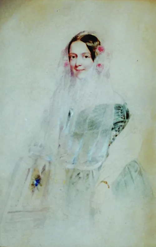 A 2828-as miniatűr, és ez az akvarell egy évben készült. A hölgy mindkét képen azonos ruhában és fátyolban van ábrázolva, a fátyol négy rózsaszín rózsával van feltűzve. A z első képen ül, itt áll. A tűllfátyol ábrázolása igazi akvarell-bravúr.