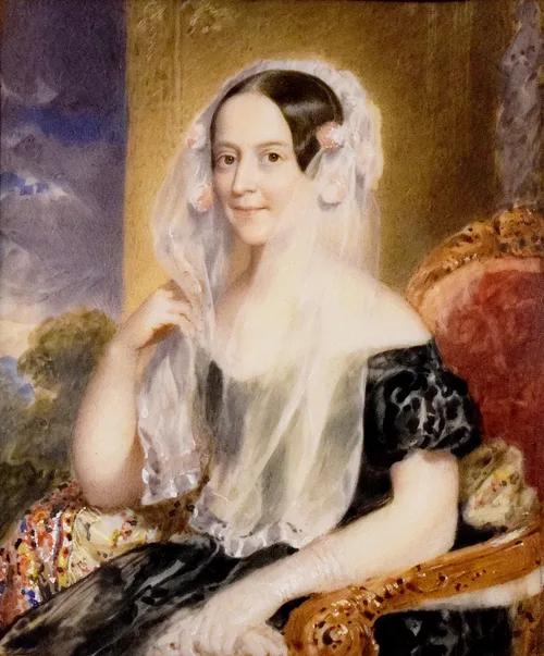 A hölgy 1841 óta felesége BM-nak. Itt egy fantázia-környezetben látjuk egy díszes, nyitott fal előtt. A legtöbbet ábrázolt vörös karosszékben ül, kasmir vállkendővel és fehér rózsákkal, arca körül rózsaszín rózsák. Ruhája fekete selyem, kezében fehér kendő. A távolban viharos táj, de a fiatalasszony körül nyugalom és csend honol. A Művész a hölgyet számos alkalommal megfestette, ezzel a fátyollal fehér ruhában is. Szépen kidolgozott realisztikus mű.