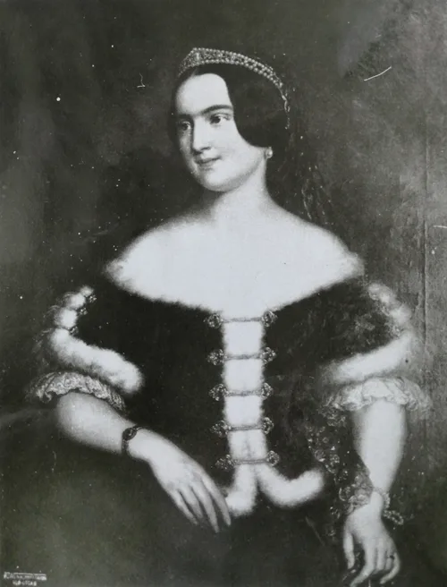 A bárónő magyaros vonásokat mutató öltözéke részben azonos Pakarny Mária ruhájával. (Jgyk 934) A sötét bársony, fehér hermelinnel szegélyezett vitézkötéses attila-szerű kabátka kissé rövidebb és mélyebben kivágott, mint Pakarnyé, záródása ékszerszerű paszománt, jellemzően főúri dísz. Fején igazgyöngyös párta, amelyről mintázott tüllfátyol csüng. A hölgy arca jellegzetes Barabás Miklós-arc, kerekded, egyenes orr, kicsi száj, sötét, kifejező szemek, szinte divatlapba illő szépség. Kezei különösen finoman formáltak, tartásuk ismét Pakarnyra emlékeztet. A mű könnyed ecsettel előadott nagyméretű olajkép, és itt inkább volt lehetősége a Művésznek, hogy elsősorban a női szépség kifejezésére koncentráljon. A két mű ugyanabban az évben keletkezett, ugyanazokból az elemekből komponált bravúr-darab.