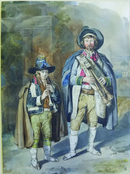A tanulmányúton járó európai festők kedvelték az itáliai folklór hagyományos szereplőit. Ilyenek a dudások, (pifferario) akiket BM is szívesen örökített meg igényes akvarelljén.
