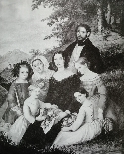 Középen feketeruhás fiatal nő ül, ölében rózsákkal, mögötte egy férfi barna kabátban, előttük fehérruhás leányka térdel. A középső nő mellett egy idős hölgy, mellette szürkeruhás kisfiú, jobbjában kivont karddal. [Baloldalukon két nagyobb leányka.] Háttérben hegy kis templomrommal, mögöttük fák. (Műtárgyfelügyeleti szöveg)