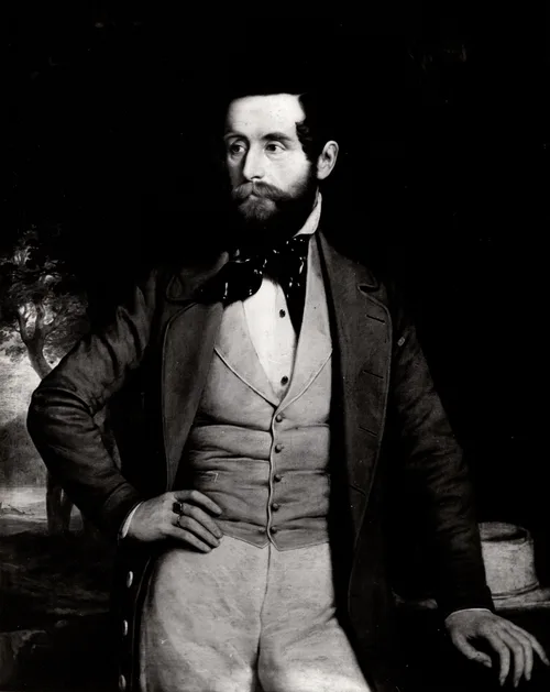 A jólöltözött, polgári ruhás úr ismert személyiség lehet, bár eddig neve nem derült ki. Lehet, hogy külföldi, furcsa formájú, fehér kalapja nálunk idegen. A legkülönösebb eleme a kompozíciónak a szokatlanul közeli, dzsungelszerű erdő, amiből következtethetünk, hogy az ábrázolt egy utazó lehet, (de nem vadász). Az életnagyságú térdkép kiváló alkotásnak tűnik, bár színes képe nem maradt fenn. Az 1937-es Biedermeier Kiállításon az első teremben szerepelt, csupa jólismert, híres mű között.