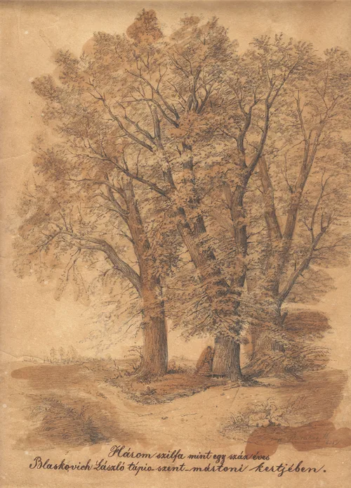 Barabás Miklós itáliai utazásáról 1835 novemberében érkezett Pestre, ahonnan ellátogatott a közeli Tápiószentmártonba, ahol a Blaskovich-család ekkor élt. Kérdés, hogy a fák még lombosak voltak-e? Valószínüleg készített itt munkákat, de sem a művek, sem jegyzőkönyvi bejegyzés nem ismeretes ezekről, e kvalitásos rajzon túl. Később többször dolgozott a híres lótenyésztő családnak.