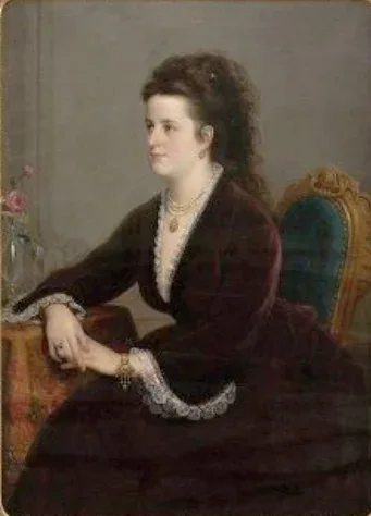 A reprezentatív portré BM kiváló művei közé tartozik a 70-es évekből. A helyes dátumra abból lehet következtetni, hogy a hölgy turnűrös ruhát visel, hegyes kivágással, – ami csak ekkor jött divatba – és hátrsasimított, hátul felborzolt frizurát, ami szintén ezeknek az éveknek a viselete. A mű legkorábban 1875-ben készülhetett. A kompozíció szándékolt könnyedsége a kezek játéka párosulva az arc és a fej merev tartásával egy csepp feszültséget okoz, amire a néző felfigyel. A kolorit fínom hatásokra épül, a bordó ruha, a gyöngyszürke háttér vonzó színválasztás. A hölgy arcának rózsaszínje a mellette levő rózsaszállal összecsengve gyengéd hatást ad. A képet tarthatjuk a századvég nyitányának BM pályáján.