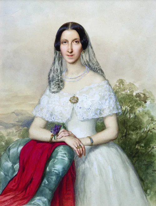 Úgy tűnik ez a fehér ruha csipkegallérral, vörös belépővel az 1850-es év nagy divatja.