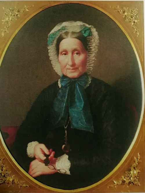 Sötétszürke háttér előtt idős nő mellképe. Sötét ruhát, fején fehér csipke főkötőt visel kék szalagdísszel. Nyakán aranyláncon függő óra. Jobbjában lornyont tart.