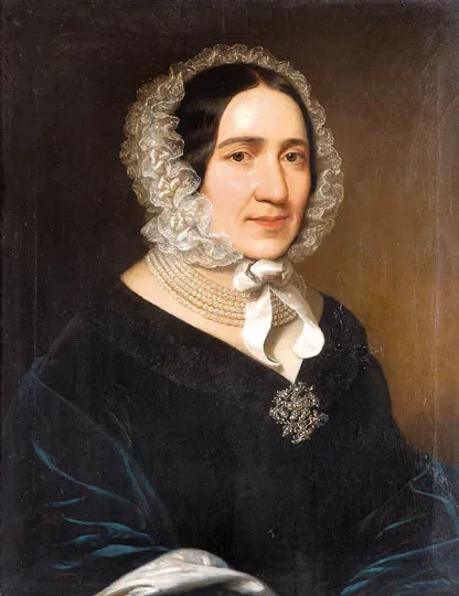 Az eléggé semmitmondó arcú, fekete ruhás modell pazar csipkefőkötőt és hatsoros igazgyöngyöt visel. Mellén bonyolult szépségű ezüst bross. Belépője kissé világos keretet ad alakjának, a kéken villanó selyem bélése fehér.