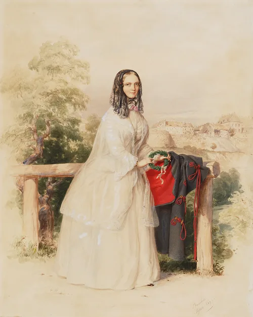 Kovács-Schmidt Emma a pesti Schmidt János megyei főorvos leánya. A szabadságharc után családja a Kovács nevet használta. Évekig gyászolta jegyesét, Nagysándor József honvéd-tábornok, aradi vértanút, majd 1853-ban Klauzál Gábor az első m. felelős minisztérium földművelésügyi miniszterének neje lett, fia Klauzál Gábor. A nagyméretű reprezentatív akvarellen a fehér menyasszonyi ruhás leány fekete gyászfátyolt visel, kezében a vértanúk babérkoszorúja, a tábornok katonaköpenyénél áll. A háttérben a szétlőtt budai vár látható. A kompozíció megfogalmazása ekkor nem volt veszélytelen, mivel az ország gyászára emlékeztet.