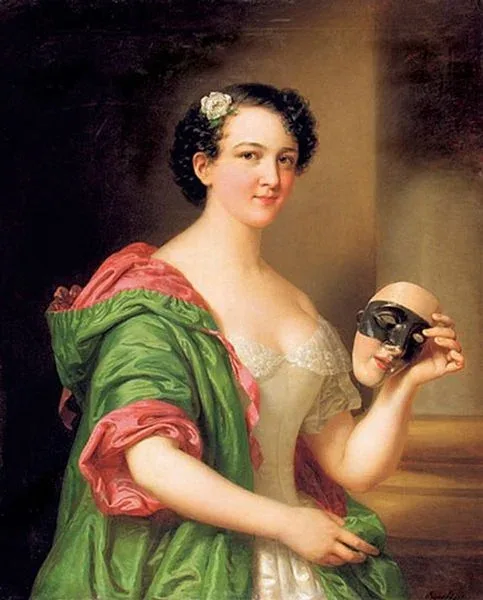A kép nagyon kedvelt, amit meg is érdemel. Igazi színész-portré, de a levett álarc sokértelmű jelképként szerepel. Ruhája nagyon hasonlatos a másik fennmaradt olajképén szereplőre, de itt jobban hangsúlyozzák a szépséges kebleket. A hatalmas zöld köpenyből kibontakozó női test és a bájos fej különben is izgalmas látvány. A biedermeier rejtett erotikája sugárzik róla.