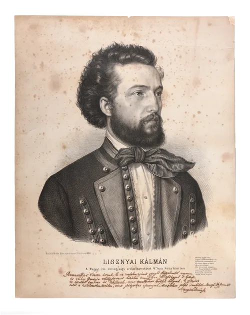 f. l. k.: „LISZNYAI KÁLMÁN / A Magyar írók életnagyságú arcképcsarnokának 4ik lapja. Kiadja Vahot Imre”; kézzel írt szöveg: „Ramasette Vincze úrnak, ki az irodalom iránti gyöngéd figyelemből engemet / és Vahot Grarét [sic!] vendégszerető házában ünnepélyes szivességgel s hazafi / úri lélekkel fogadott és nőjének, mint emelkedett kedélyű hölgynek, ki gyönyört / talál a költészetben, zenében, mint jóságteljes asszonyunk, tisztelete jeléül s emlékül. Sümegh. 59 junius 25. / Lisznyai Kálmán”; jobbra: „Barátság az élet veleje / Legyen szivünk csordultig vele, – / Szívünk tőle szabadabban ver / Ez alapon legyen az ember. / Mi az élet ízét adja: / Dal, bor, szerelem lovagja. /...Iszunk, dalolunk, szeretünk, / Boldogságról álmodunk, / Haragszunk is a kire kell, / Áldunk, sírunk, kacagunk. ”