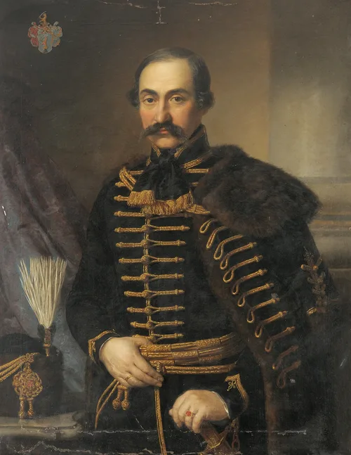A századok alatt kialakult ősgaléria-hagyományokat a legszigorúbb módon követő rangos családi portré. Ruhája azonos a 18. századi reprezentatív magyaros viselettel, övével, kardkötőjével együtt. Nagyúri környezet, színjátszó taft drapéria, méretes oszlop veszi közre. Roppant akkurátus ecsetkezelés, minden valóságos, különösen aggályos festésű a nyakravaló rojtja, a szőrme, a bajusz. A kép merevségét talán a sugallni kívánt eszme okozza.