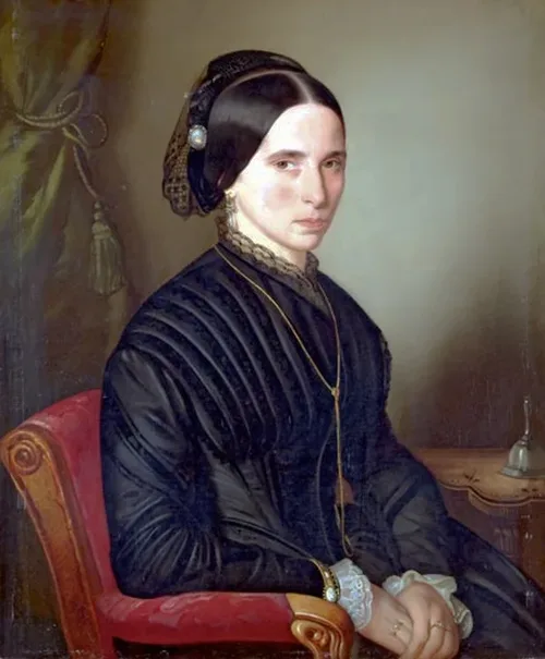 A hölgy kétségkívül gyászruhát visel, fején kis fekete csipkefátyollal. Arckifejezése mélységesen szomorú, ami egészen kivételes Művészünknél. A gyászolt személy nyilván a harcokban esett el. A kép fontos eleme a szomorú szem, itt a Mester régi fogását – hogy a felső szemhéjat rozsdaszínnel húzza ki – most megtoldja a szemöldök alatti és a szemgolyó alatti mély rózsaszínnel, ettől a szem körüli színek elmélyülve segítik a bánat ábrázolását.