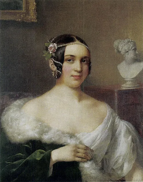 A kép Barabás Miklós tulajdonában maradt haláláig. Feltehetőleg azonos vagy replika: Női szépség a harminczas évekből, Barabás hagyatéki kiállításán, (Kolozsvár 1938.) A Petrikovich név a Művész halála után kapcsolódott a képhez. (Veszprémi 2011: 145.) „A kor egyik népszerű színésznőjét ábrázoló képén Barabás a művészi magatartásformát megjelenítő reneszánsz ábrázolási hagyományt követi: az egyik vállon lecsúszó, ejtett ruha évszázadokon keresztül ennek a könnyed, lezser attitűdnek az egyik külső jegye. ... A mű másik említésre méltó mozzanata a színésznő mögött jobb oldalon látható Venus-büszt, amely feltehetőleg Canova, illetve Ferenczy István nyomán készült szobormásolat, amelynek megjelenítésével Barabás a szépség, az érzékiség hangsúlyozására törekszik. Ez az ábrázolás korai előfutára a Szvoboda Dománszky Gabriella által megnevezett, a negyvenes évek közepe táján készült színészportréknak,...". Hessky 2004: V–8. 483.