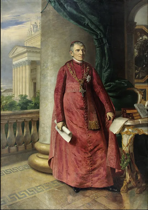 E portré mint reprezentatív hivatalos főpapi képmás, világi környezetbe készült, az egri Városháza dísztermébe. A képet nagyszabású ünnepélyen adták át a köznek, kétnapos rendezvény keretében, ahol a festő dísz-palettát kapott. Pyrker János László Eger városának, sőt az ország kultúrájának gyámolítója, jóízlésű mecénás. Legfőbb tetteit a festő a főpap kezében levő iraton felsorolta, a háttérben pedig az Egri Főszékesegyház homlokzata látszik, amelyet többek között Pyrker építtetett, belső berendezését magánvagyonából finanszírozta. A magyarországi művészeti kultúra szempontjából egyedülálló tette, hogy kiváló festménygalériájából, – amelyet mint velecei patriarka gyűjtött – az 1832–1836-os országgyűlés utolsó napján 154 db-ot, a Nemzeti Múzeumnak ajándékozott. E képanyag Szépművészeti Múzeumunk képtárának ma is magas kvalitású, – és értékű – alapját képezi. Az alkotás nagyszabású miliőjében, az érseki palotában a képtár egy darabja is feltűnik, jobbra, a következő teremben. (Paolo Veronese: Velence allegóriája, SzM) „A mű az egyházfejedelem kegyességének, közéleti és költői érdemeinek reprezentatív összefoglalója lett, a komplex programot feltehetőleg maga az ábrázolt koncipiálta. Pyrker monumentális figurája egy nyitott architektúrai keretben áll, márványoszlop és leomló zöld bársonyfüggöny előtt, elegánsan és kétségkívül igen mértéktartóan megőrizve a barokk uralkodói portrék látványos külsőségeit. A főpapi reverenda vörös pompája alkalmat adott a romantika megcsillanására is, amely a vörös-zöld komplementerre épülő koloritban az óvatosan alkalmazott átlós kompozícióban sejlik fel. Az egyszínű ruha arra késztette a festőt, hogy laza, repkedő, szálkázó ecsetkezelést alkalmazzon, a homogén felület megbontására. Az alakot körbeveszi a vörös moiré szegélyes érseki köpeny, hátán függ a széles karimájú kalap. Mellén, baloldalon, a szív felett a Magyar Királyi Szent István Rend gyémántos rendjele, nyakában a hivatalát jelző gazdag ékszer, a drágakövekkel kirakott egyenes érseki kereszt függ. Alatta az 1825-ben kapott vaskorona rend jelvénye látható a kétfejű sassal, amely ,,...mintegy politikai mondanivalót is kifejez, utal az ábrázoltnak a Habsburg ház iránti lojalitására." (Rózsa György: A Pyrker-ikonográfia képtípusai. In: Pyrker emlékkönyv 1987. 304.) Uralkodó elem a környezet látványos perspektívájának ábrázolása, ami iránt a festő élénken érdeklődött.