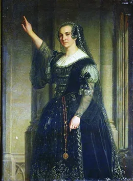 A már nem fiatal, de kiváló énekesnő iránti nagy tiszteletet érezteti az Erkel: Hunyadi László c. operájából Szilágyi Erzsébet szerepében festett képmás. Pompázatos fekete csipke gyászruhája, fekete tüllfátyla mély gyászt éreztet, hisz az ország reménységét jelentő, kivégzett Hunyadi Lászlóért – fiáért – hordja. Keze az ég felé mutat, jelezve, hogy csak Isten segítségében bízhatunk. A kép anyagfestése a legfeltünőbb, a fekete tüllök a fehér ruhaujjakon és a bőrön való áttetszés remekül van megoldva, az egész képen uralkodó sötét hangvételt fokozza. Egyébként „...az ötvenes években a magyar honleányok a nemzeti gyász jeléül általában fekete ruhát viselnek. A gyászruhás dámák ábrázolatai teljesen szinkronban vannak a magyar valósággal, nem intim, személyes érzelmeket mutatnak, hanem a közös fájdalom büszke vállalásával tüntetnek. A sok gyász festése következtében a Mester nagy gyakorlatra tett szert a különféle fekete csipkék, bársonyok, atlaszselymek bravúros előadásában." SzDG 1983.