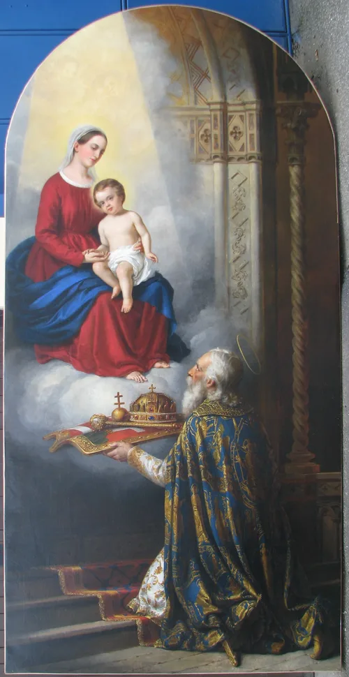 Szent István magyar király Maria előtt térdelve. A zentai Szent István kápolna főoltárképe (Jgyk 1025, 1026, 3023)