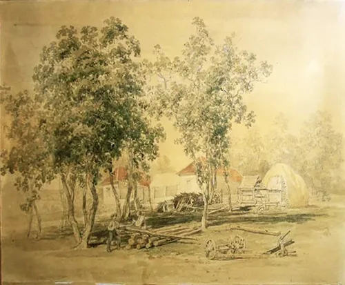 A kép bal oldalán és középrészén lévő zöld lombú fák között két férfi fekvő fahasábokra helyezett fát fűrészel, mellettük jobbra egy ekét látunk. A háttérben két, kerítéssel szegélyezett piros-tetejű ház áll, mögöttük fák láthatók. A jobb oldali ház előtt farakás, mellette kutyaól (?) helyezkedik el. Jobb oldalt a házak mellett egy boglya, előtte csűr. (Műtárgyfelügyelet)