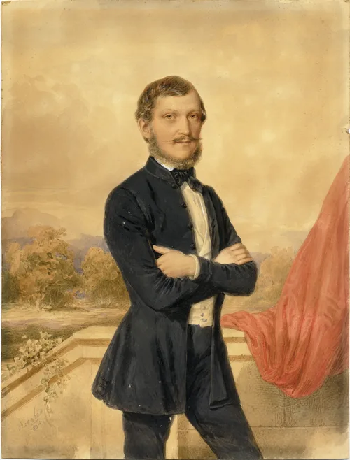 Lépcső kőkorlátja előtt szőke fiatal férfi melle előtt összefont karokkal, térdig ábrázolva. Jobbra piros drapéria, a háttérben fák, majd távoli hegyek körvonala látszik. Az ábrázoltat feltehetőleg kastélyának lépcsőkorlátja előtt látjuk, öntudatos tartásban, mögötte felsejlik birtokának látképe.